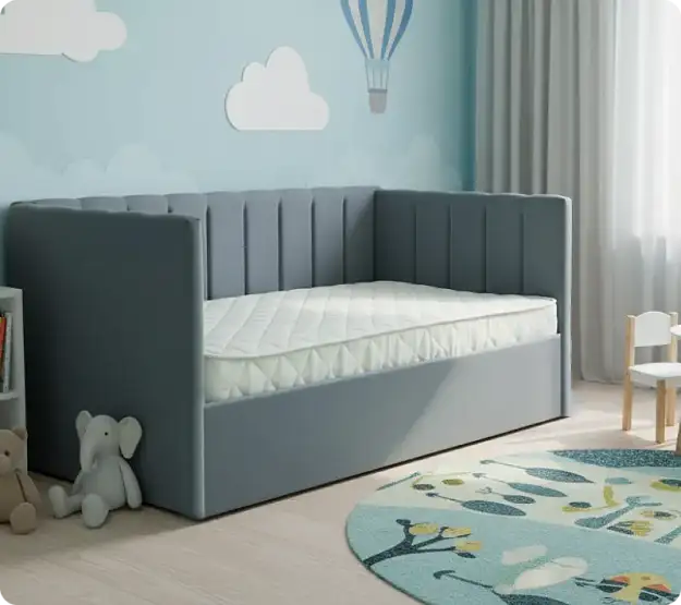 Основные особенности кровати:Спальное место: 90×200 см — оптимальный размер, подходящий как для детей, так и для подростков. Подъемный механизм: В комплекте идёт удобный механизм, который позволяет легко приподнимать спальное место, открывая доступ к просторному отсеку для хранения. Там можно разместить постельное бельё, одеяла, подушки или любимые игрушки, что поможет поддерживать порядок в комнате. Материал обивки: Возможность выбора ткани — Рогожка или Велюр. Оба варианта отличаются практичностью, износостойкостью и приятной текстурой. Универсальный дизайн: Кровать подойдёт как для мальчиков, так и для девочек, а широкий выбор цветов обивки позволит подобрать идеальный оттенок под любой стиль и предпочтения ребёнка.